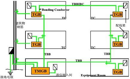 • 當建筑物中使用兩個或多個垂直接地互聯主干時,為了保證接地互聯主干之間電位相等,接地干線之間每隔三層及頂層需用接地互聯主干互聯導體(Telecommunications Bonding Backbone Interconnecting Bonding Conductor ,簡稱TBBIBC)相聯結。